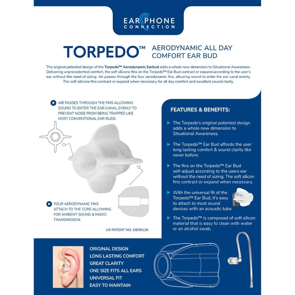 The Earphone Connection Torpedo Earbud (3-Pack) delivers lasting comfort, clear audio and situational awareness. Attach to any two-way radio acoustic tube earpiece. Easy to clean. Replaces standard mushroom style eartip.